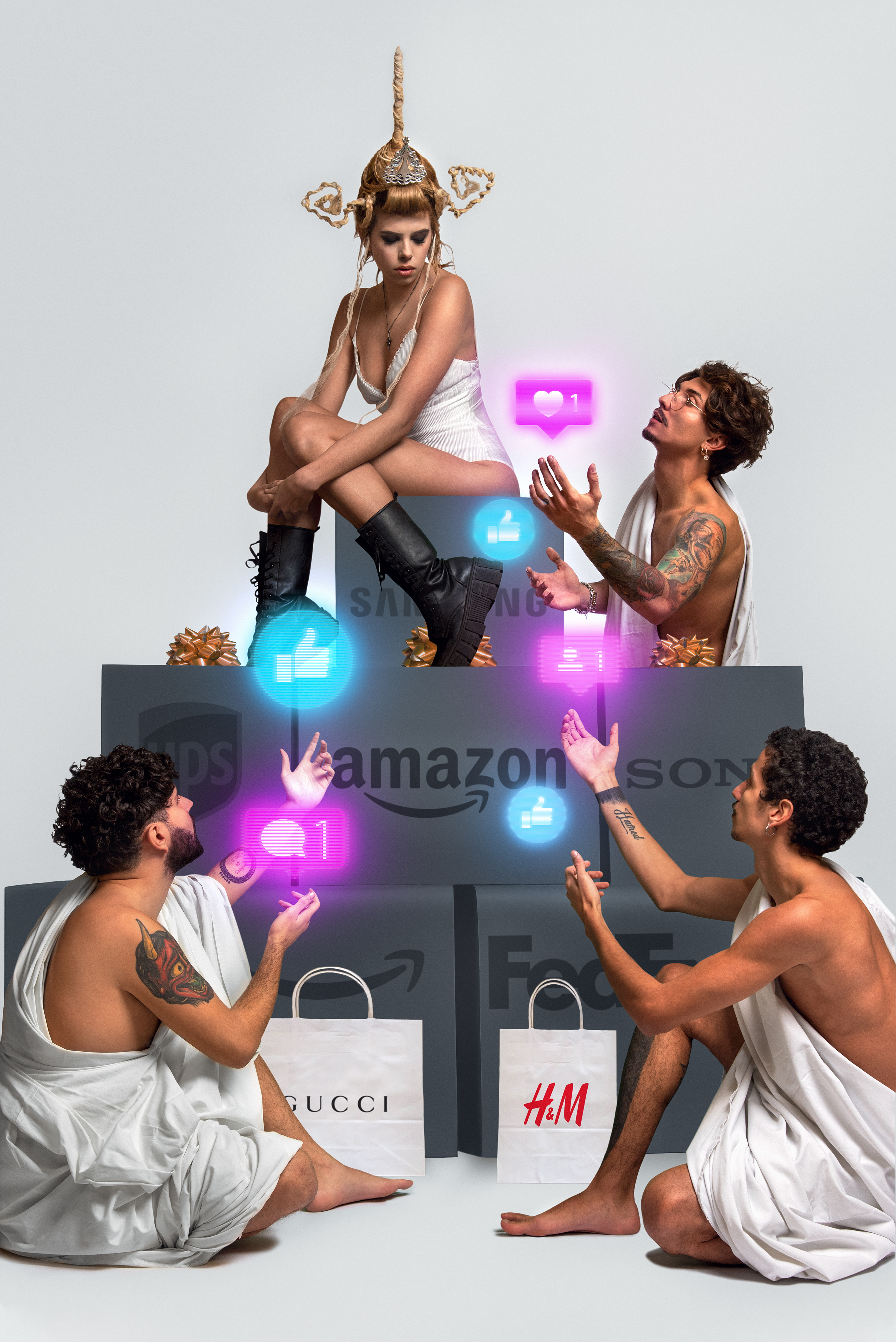 I tried to create a modern version of the classic nativity (with a little Fantasy taste), in a contemporaneity so full but empty, apparently cozy but extremely cold; where the real miracle is the internal rebirth of each of us, discovering that it is not the brands or the infinite bidders that make the Christmas tree, but ourselves when we burn in our BEING. My hope is in a world that IS and not that SEEMS.
